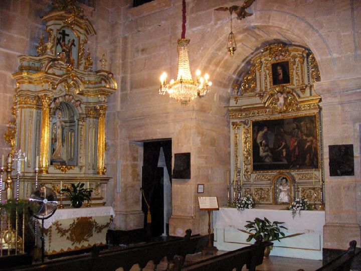 Por su parte la portada, a modo de retablo barroco en piedra, se caracteriza por su riqueza simbólica y decorativa, plena de armonía, en donde el juego de volúmenes, luces y sombras, dotan a esta obra de gran personalidad y belleza.